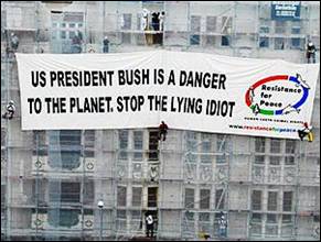 Skønt 3.000 østrigske politifolk og hundredevis af CIA-agenter havde fået til opgave at sørge for, at demonstranterne ikke kom for tæt på mr. Bush, kunne de ikke forhindre, at en aktivist fra gruppen „Resistance for peace – Widerstand für den Frieden“ klatrede op på taget af den irakiske ambassade lige over for det hotel, hvor Bush var indlogeret. Da aktivisten rullede en stor transparent ud, blev han dog anholdt af det østrigske anti-terror korps „Cobra“.