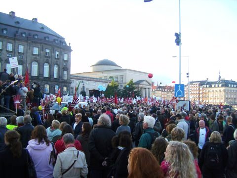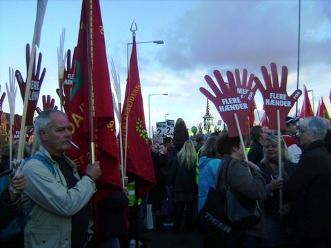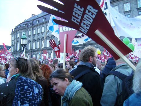 ‘Stop nedskæringerne’, ‘Mere i løn’ og ‘Flere hænder’ var meget synlige budskaber. Mange demonstranter krævede Foghs afgang – og med ham Haarders, Sanders og hele regeringens. I København gennemførtes på Slotspladsen igen en af de største demonstratione i mange årtier, endnu større end 3. oktober sidste år. Masseaktioner og masssemanifestationer er for alvor blevet aktuelle kampmidler.