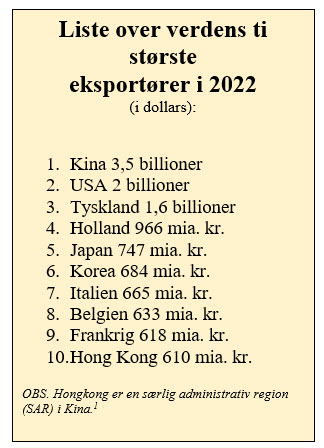 Ifølge Verdenshandelsorganisationen (WTO)[1] er Kina det land i verden, der eksporterer flest varer og indtager førstepladsen blandt de største eksportøkonomier. Desuden stod Kina ifølge WTO for 15,1 % af det samlede salg i verden, mens USA stod for 7,9 % og Tyskland for 7,3 %. Brasilien, et land, der anses for at have en mellemstor kapitalistisk udvikling, ligger på 25. pladsen. Ud over at indtage 2. pladsen eksporterer USA 45,8 % mindre end Kina.