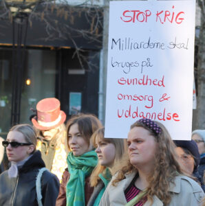 Vi siger nej til NATO og monopolernes EU. Nej til de øgede krigsbudgetter, øget krigsindustri, dansk krigsdeltagelse, flere soldater og også kvindelige soldater. Statsminister Mette Frederiksen vil lægge landet åben for amerikanske militærbaser og franske atomvåben og taler om at sende soldater til Ukraine. For at sikre fremtiden, siger hun. Det er krigens og imperialismens fremtid, hun taler om. Ikke vores.