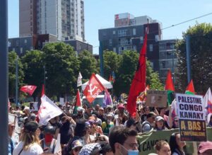 Denne gang tog protesten til i styrke i løbet af weekenden, hvor lørdagens demonstration var et højdepunkt. Vores parti opfordrede til denne aktion, der blev støttet af en lang række organisationer, foreninger, fagforeninger, kollektiver og politiske partier (se meddelelsen på vores hjemmeside). Nedenstående korrespondance giver et indtryk af dette. Det skal bemærkes, at regeringen har besluttet at skjule de israelske monopolers stande bag paneler. En beslutning, der skal tilskrives mobiliseringen mod fortsatte leverancer af militært udstyr og fortsat samarbejde med israelske monopoler… som CGT-havnearbejderne i Fos-sur-Mer og Disclose og Stitch’s efterforsknings- og afsløringsarbejde havde afsløret offentligt.