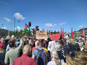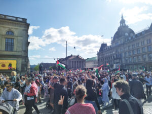 En time før demoen startede, stod vi en gruppe fra APK og delte løbesedler ud, og allerede der myldrede folk op fra metroen og grupper havde samlet sig på slotspladsen, hvor der de næste halvanden time lød kampråb, trommer, taler og klapsalver. Den største Palæstinademo til dato, den største demo i Danmark i 13 år. Ikke alene var Slotspladsen fyldt, men også sidegaderne. På størrelse med den store lærerdemo for 13 år siden.