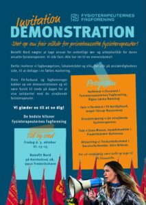 12 fysioterapeuter i Frederikshavn og Sæby ansat på den private klinik Benefit Nord har strejket siden 15. maj med kravet om en overenskomst med den nystartede fagforening ”Fysioterapeuternes fagforening” i ryggen. Arbejdsgiveren står stejlt og forhandlingerne er gået i stå, og derfor indkaldes der nu til demonstration. Det er første gang at privatansatte fysioterapeuter er i strejke.