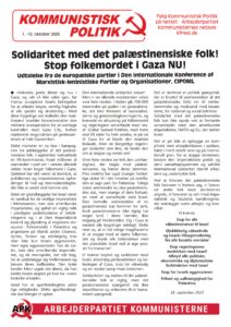 I Kommunistisk Politik, der udkommer hvert 14. dag kan du læse om APKs holdninger til vigtige begivenheder i klassekampen – bl.a. hvorfor vi skal styrke kravet til regeringen om at stoppe sin støtte til Israels folkemord. Om spørgsmål i marxismen-leninismen. Om aktuelle udgivelser, som baggrunden palæstinenserne lange kamp, og aktiviteter i APK