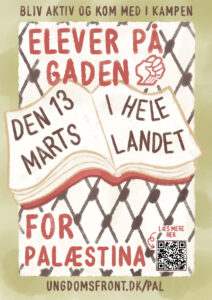 Unge vil ikke være passive tilskuere til at Israel gennemfører et folkemord på den palæstinensiske befolkning. Et folkemord der støttes aktivt af den danske stat, der sikrer våbensalg til Israel. D. 13. marts planlægger unge over hele landet at gå i undervisningsstrejke for Palæstina. Det konkrete krav bag strejken lyder: Våbenembargo nu!