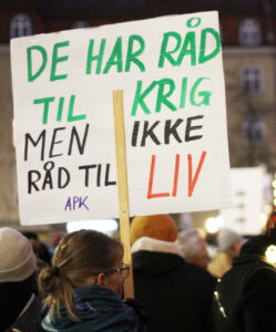 ”Og så snakker de om, hvor nødvendigt det er for vores sikkerhed i hverdagen. Det må vi da kunne forstå, med alt det der sker rundt om i verden. Nej faktisk ikke. Hvilken sikkerhed giver milliarder af kroner til investeringer i krigsindustrien? Sikkerhed for gode aktieafkast, ja. Skal jeg fortælle dig, hvad der gør min hverdag enormt usikker? Det er at tænke på, at de samme politikere vil sende mine børn i krig som soldater, som sikkerhed for at de kan fortsætte deres politik og beskytte de rige og dem der har magten. Det er jo dybest set den sikkerhed de taler om. Politikkerne beskytter dansk erhvervsliv og deres interesser og lader os arbejdere, offentligt ansatte og unge betale.”